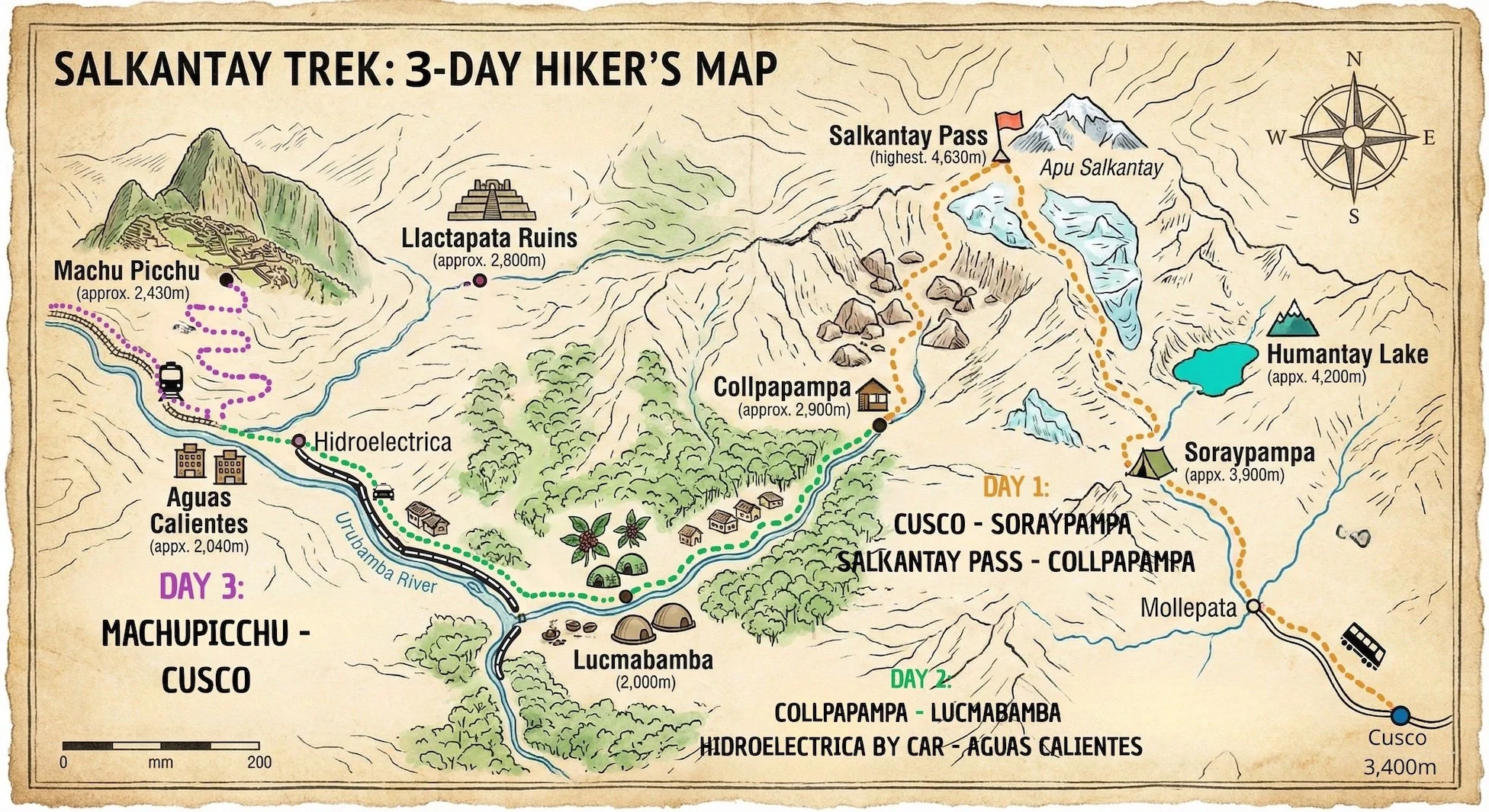You leave Cusco at 4:00 AM and drive directly to Soraypampa. You skip the acclimatization night and start hiking immediately toward the Salkantay Pass. After conquering the 4,630m summit, you endure a long, steep descent into the cloud forest.